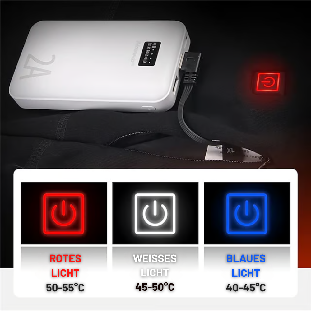 Alle THERMA Artikel enthalten integrierte, flexible Heizelemente, die über eine handelsübliche 5V Powerbank mit Energie versorgt werden. Nach dem Einschalten erwärmt sich das Material gleichmässig innerhalb weniger Sekunden. Je nach Produkt sind mehrere Wärmezonen integriert, die für konstante, angenehme Wärme sorgen – ohne Überhitzung oder Hitzestau.